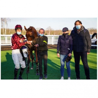 ses couleurs pour la première fois sur l'hippodrome des Sables d'Olonne avec LA RENOMEE, qui ouvre aussi son palmarés pour sa deuxième sortie. Elle était associée à Thomas Dupouy-Bataille. Une belle victoire, félicitations à l'écurie JAB et merci!